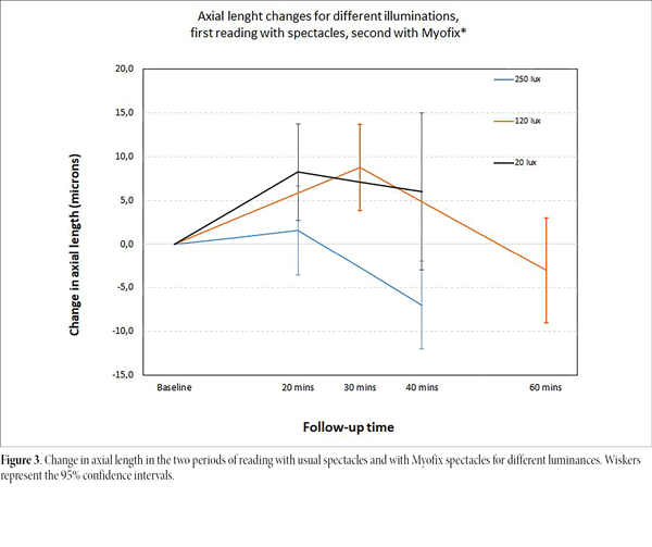 Figure 3. Change in axial length in the two periods of reading with usual spectacles and with Myofix spectacles for different luminances. Wiskers represent the 95% confidence intervals.