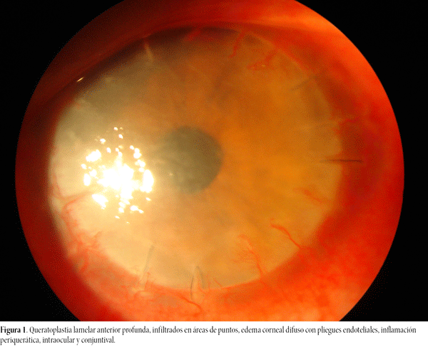 Figura 1. Queratoplastia lamelar anterior profunda, infiltrados en áreas de puntos, edema corneal difuso con pliegues endoteliales, inflamación periquerática, intraocular y conjuntival.