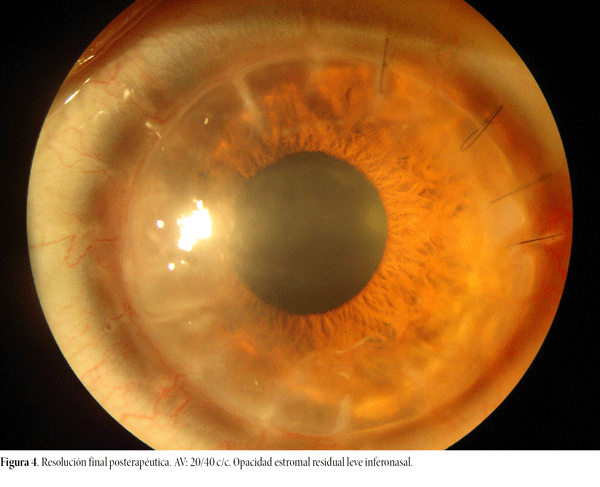 El examen directo, el cultivo, la PCR panfúngica y la PCR para Acanthamoeba fueron todos negativos y la PCR en tiempo final para HSV-1 y 2 fue positiva. La PCR en tiempo real fue positiva para HSV-1 y detectó 1,5 x 104 copias/µg (1,5 x 10.000 copias/µg) de muestra. Se lo trató con moxifloxacina y voriconazol 1% cada 3 horas como prevención, ganciclovir 0,15% cada 4 horas y aciclovir oral 800mg/8 horas como tratamiento específico. A los cuatro días, luego de una mejoría inicial, se agregó prednisolona acetato 1% cada 3 horas y luego un tapering progresivo. Mejora todo el cuadro, cede el edema y pliegues endoteliales dejando una opacidad estromal nasal inferior con una visión de 20/40 c/c (fig. 4). Se realizó un seguimiento de un año sin recidivas, rechazo o complicaciones con un tratamiento tópico de prednisolona acetato 1% y ganciclovir 0,15% gel cada 24 horas y aciclovir oral 400 mg cada 12 horas de mantenimiento.