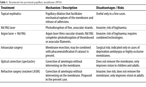 Management depends on age and the degree of visual compromise (Table 1). Options include optical correction with spectacles6, topical atropine7, surgical removal of the membrane in cases of visual axis occlusion7-8, or phacoemulsification when associated with cataract7. Nd:YAG laser therapy has also been reported9, either alone or combined with argon laser, the latter being useful for thinning the membrane prior to Nd:YAG photodisruption10.