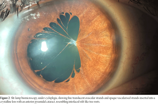 Figure 2. Slit-lamp biomicroscopy, cycloplegia, showing fine translucent avascular strands and opaque vascularised strands inserted into a crystalline lens with an anterior pyramidal cataract, resembling interlaced stilt-like tree roots.