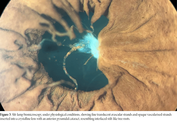 Figure 3. Slit-lamp biomicroscopy, under physiological conditions, showing fine translucent avascular strands and opaque vascularised strands inserted into a crystalline lens with an anterior pyramidal cataract, resembling interlaced stilt-like tree roots.