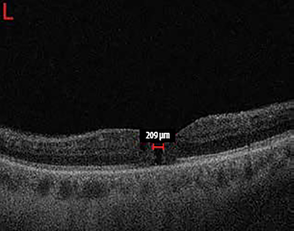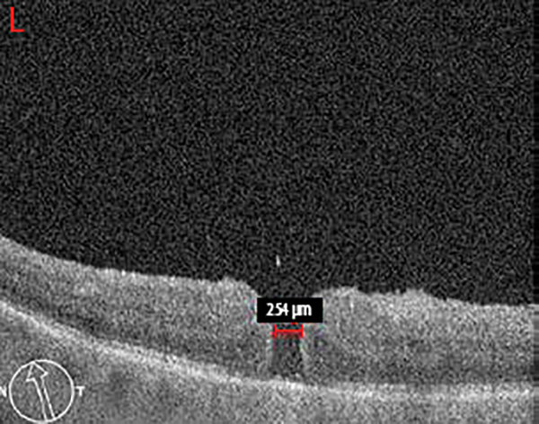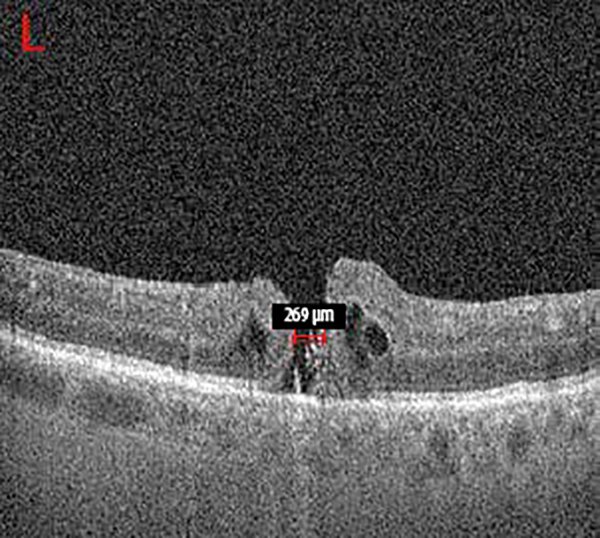 Figura 4. Agujero macular en OI con un tamaño de 269 micras mediante OCT.