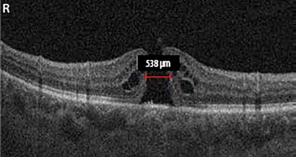 Figura 5. Mediante OCT del OD se observó AM con un tamaño de 538 mcm, con espacios quísticos intrarretinales y eversión de los bordes.