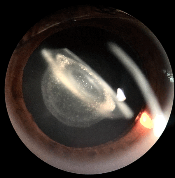 Esta imagem ilustra uma forma rara e visualmente impressionante de catarata congênita, na qual a disposição concêntrica das opacidades apresenta interesse tanto clínico quanto estético. Sua documentação contribui para a compreensão das variações morfológicas das cataratas congênitas e destaca a importância de um exame pré-operatório minucioso para a seleção personalizada da lente intraocular.