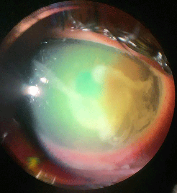Despite the adversity, the outcome was favorable. The initial prognosis was challenging due to the limited local availability of anti-amoebic treatments (polyhexamethylene biguanide and chlorhexidine in ophthalmic magistral formulations), which are not obtainable on the island. The patient was referred after 24 hours of evolution while receiving moxifloxacin 5 mg/ml and erythromycin lactobionate 0.05 g every 2 hours, together with loteprednol 0.5% every 6 hours. As shown in the images (a sequence of two slit-lamp photographs), he presented filamentous discharge and an immune ring compatible with Acanthamoeba keratitis. After establishing a presumptive diagnosis, arrangements were made to obtain the appropriate medication, which would have taken three days to arrive; however, the patient was able to travel urgently to Buenos Aires and begin treatment immediately. The case also highlights a systemic failure: despite the medical contraindication, the patient was able to purchase contact lenses at an optical shop —something that should never occur.