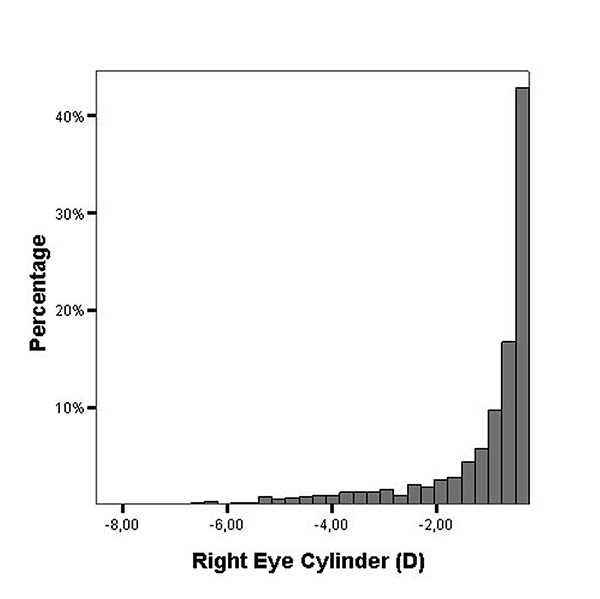There were 165 subjects (2.69% of the whole sample) with myopic spherical equivalent ≤ -0.50 diopters (limit -12.25 diopters). There were 436 (7.09%) subjects with refractive cylinder ≤ -2.00 diopters (limit -8.50 diopters), 984 (16.02%) with cylinder ≤ -1.00 diopters and 1391 (22.64%) cylinder ≤ -0.75 diopters. Figure 2 shows the distribution of refractive cylinder and Figure 3 the distribution of the axis of these cylinders, which were mainly with-the-rule.