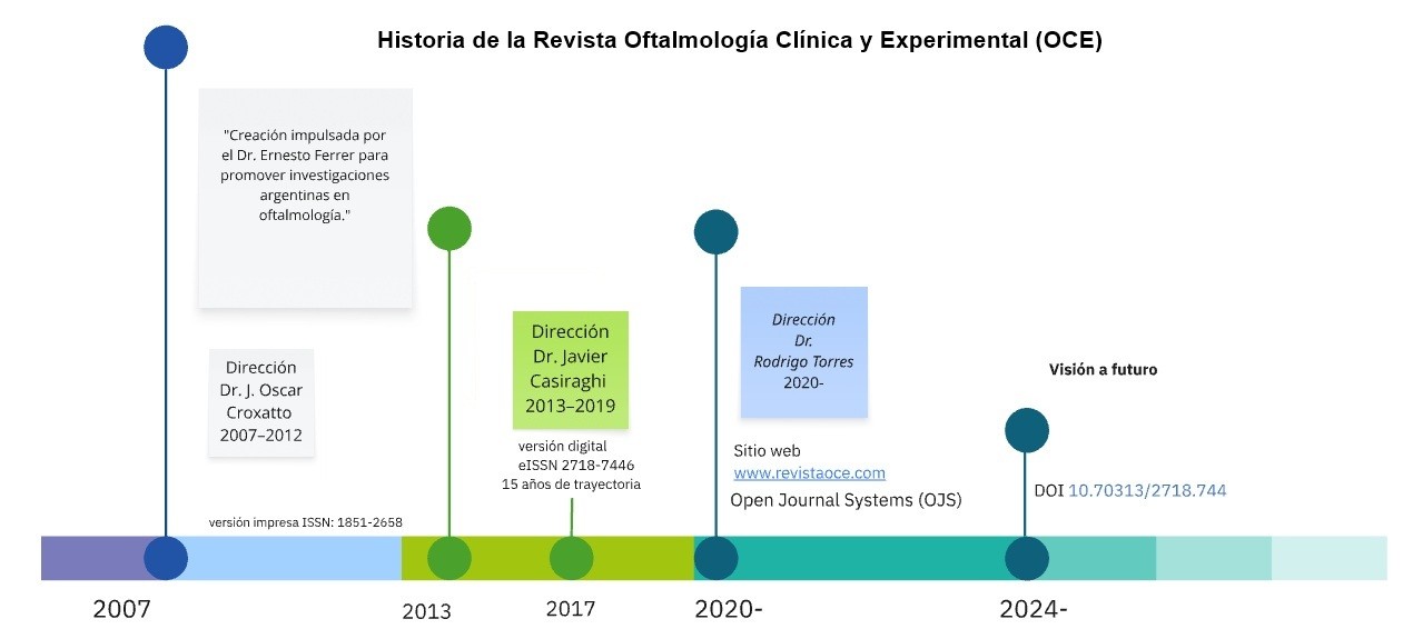 La revista Oftalmología Clínica y Experimental (OCE) fue fundada en junio de 2007 por iniciativa del Dr. Ernesto Ferrer, quien en ese momento se desempeñaba como presidente del Consejo Argentino de Oftalmología.